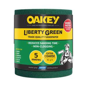 Norton Oakey sanding roll 115mm x 5m 40 grit. Liberty Green sandpaper roll are the professional decorator’s first choice when sanding – it works faster, lasts longer and fails to clog; delivering everything a true tradesperson requires. Constructed from premium grade aluminium oxide and a heavy E-weight backing, Liberty Green is self sharpening, anti-clogging, extremely durable and lasts up to 10 times longer than standard sandpaper. Perfect for everyday decorating or even for heavy duty applications.